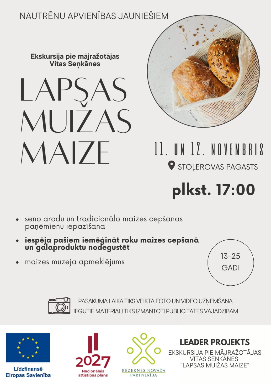 Nautrēnu apvienībā ES ELFLA intervences „Darbību īstenošana saskaņā ar sabiedrības virzītas vietējās attīstības stratēģiju, tostarp sadarbības aktivitātes un to sagatavošana” (LA 19) aktivitātē „Kopienu spēcinošas un vietas attīstību sekmējošas iniciatīvas” atbalstītā projekta “Aktīvai jaunatnei Nautrēnu apvienībā” ietvaros 11. un 12. novembrī Nautrēnu apvienības pagastu jaunieši dosies pie mājražotājas Vitas Seņkānes uz saimniecību “Lapsas muižas maize” Stoļerovas pagastā.