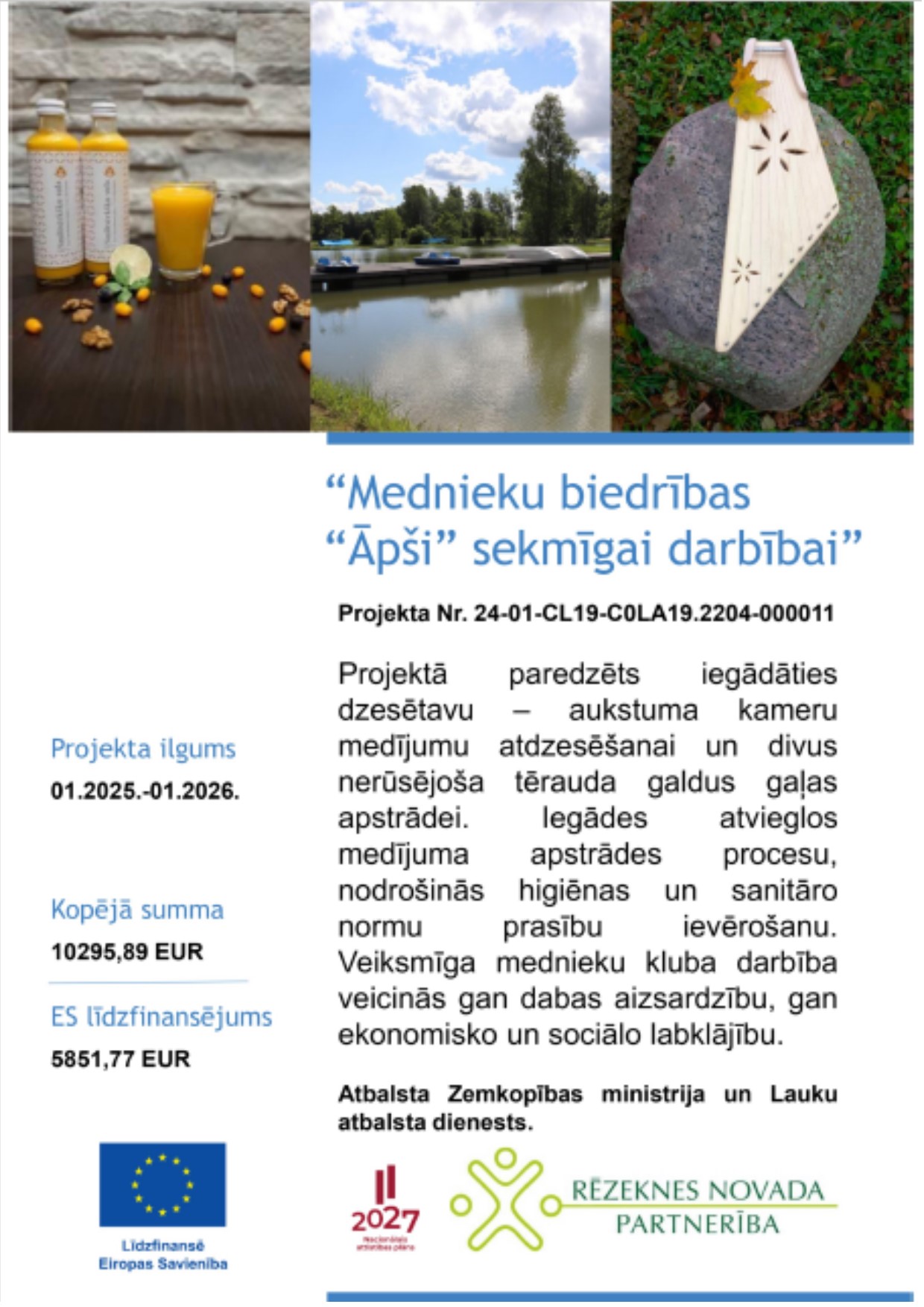 Lendžu pagastā reģistrētā mednieku biedrība “Āpši” īstenojusi ES ELFLA intervences „Darbību īstenošana saskaņā ar sabiedrības virzītas vietējās attīstības stratēģiju, tostarp sadarbības aktivitātes un to sagatavošana” (LA 19) aktivitātē „Kopienu spēcinošas un vietas attīstību sekmējošas iniciatīvas” atbalstīto projektu “Mednieku biedrības “Āpši” sekmīgai darbībai”.