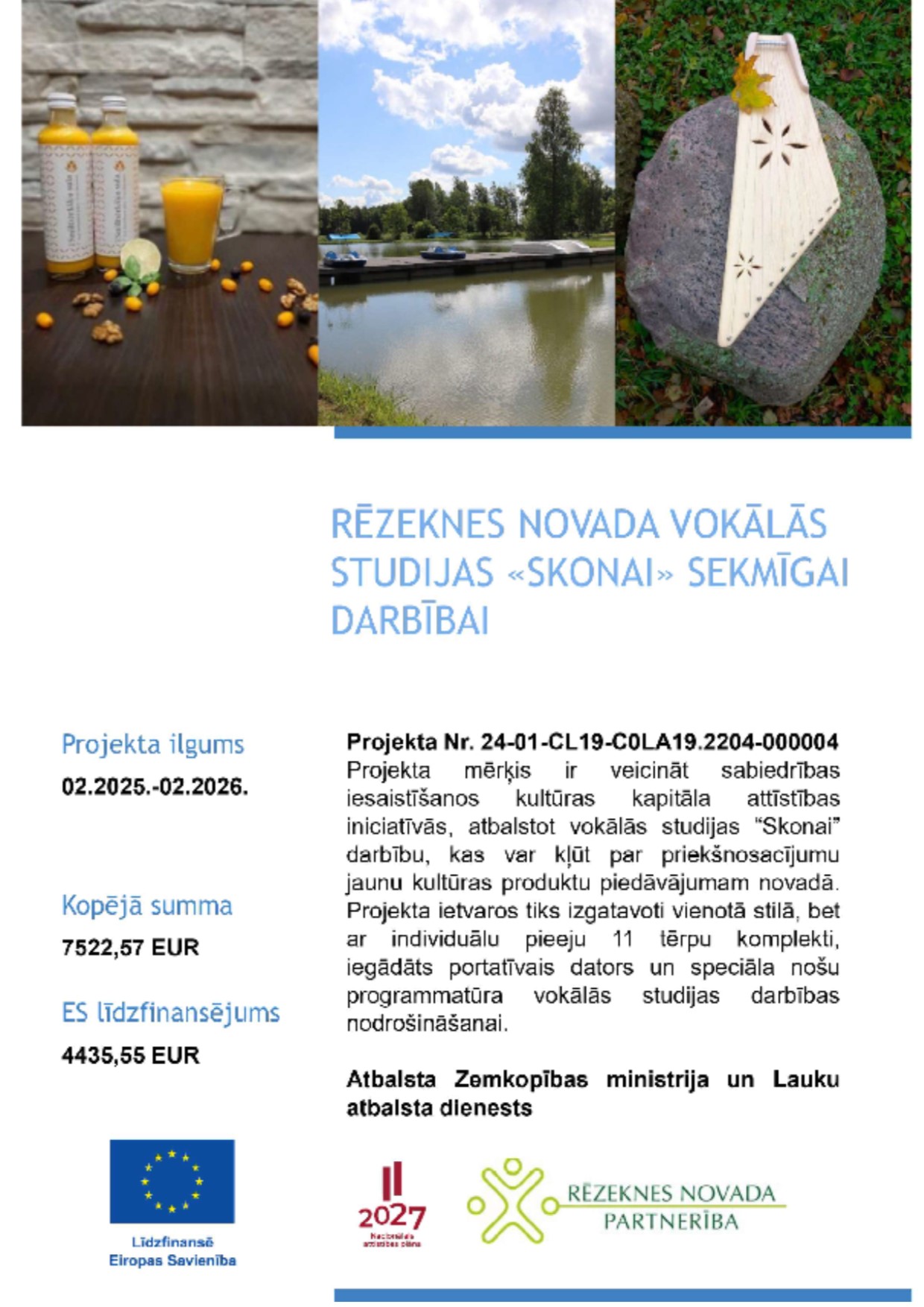 Rēzeknes novada pašvaldība īstenojusi ES ELFLA intervences „Darbību īstenošana saskaņā ar sabiedrības virzītas vietējās attīstības stratēģiju, tostarp sadarbības aktivitātes un to sagatavošana” (LA 19) aktivitātē „Kopienu spēcinošas un vietas attīstību sekmējošas iniciatīvas” atbalstīto projektu “Rēzeknes novada vokālās studijas „SKONAI” sekmīgai darbībai”.