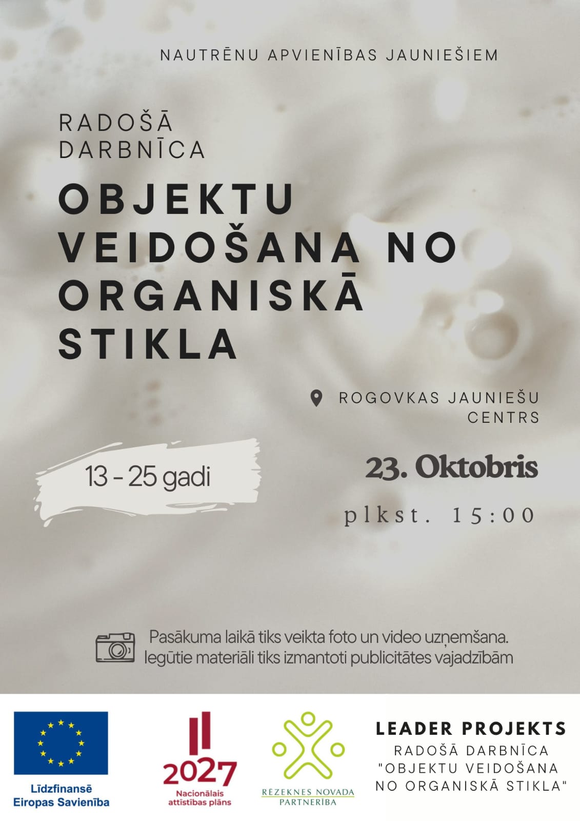 Nautrēnu apvienībā ES ELFLA intervences „Darbību īstenošana saskaņā ar sabiedrības virzītas vietējās attīstības stratēģiju, tostarp sadarbības aktivitātes un to sagatavošana” (LA 19) aktivitātē „Kopienu spēcinošas un vietas attīstību sekmējošas iniciatīvas” atbalstītā projekta “Aktīvai jaunatnei Nautrēnu apvienībā” ietvaros 23. oktobrī plkst. 15.00. Nautrēnu apvienības pagastu jauniešiem notiks radošā darbnīca “Objektu veidošana no organiskā stikla”. Nodarbība notiks Nautrēnu pagasta Rogovkas jauniešu centrā.